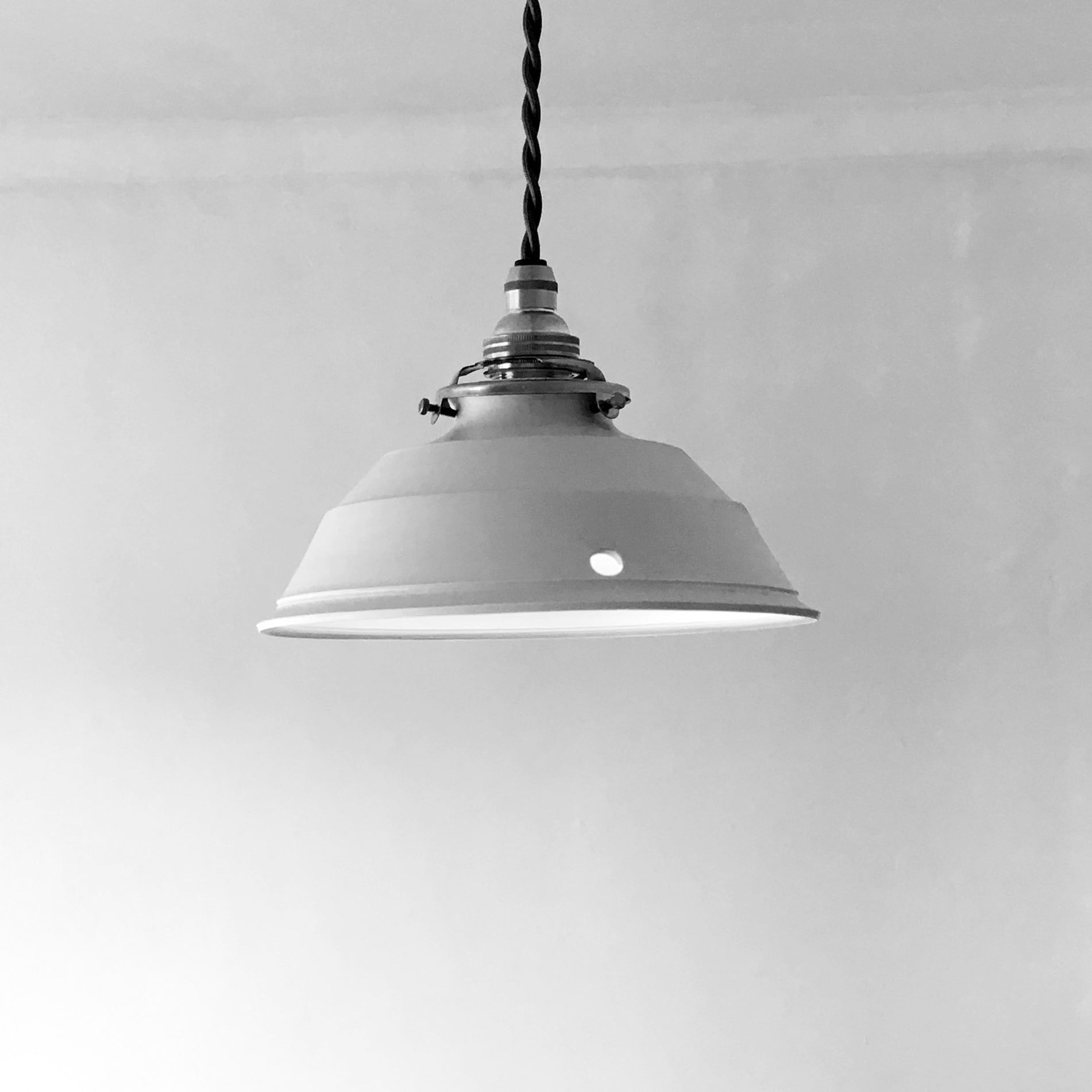 現代的な空間や家具、古物等、様々なインテリアと調和し、洋の東西や掛ける場所を問いません。シンプルな形ゆえに細部のラインが引き立ち、掛けておくだけでも美しいデザインです。磁器製で、轆轤を用いてひとつひとつ手作業で製作しています。型を用いているかのような精巧さとマットな質感が特徴です。透過性はありません。shade-aとは大きさだけでなく、デザインも異なります。